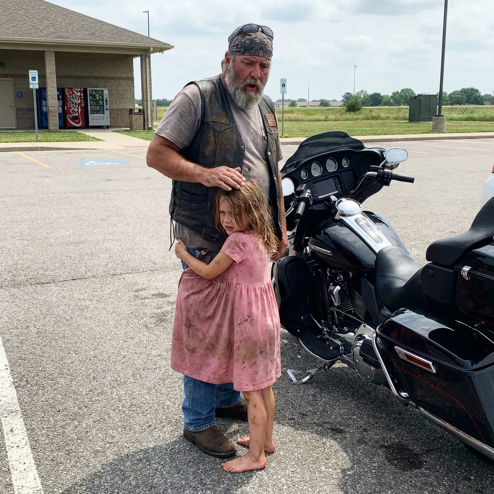 The girl stood in the middle of the parking lot, shoulders shaking. Not making a sound but clearly sobbing. Then she saw me. Six-foot-two, two-forty, leather vest covered in patches, gray beard down to my chest. Most kids would run.